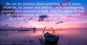 When the realization dawns that we’re buried in worry, our best tactic is to follow Paul’s instructions in Philippians 4:6-7. You’re probably familiar with these verses already. Now might be a good time for us to post them around the house–even memorize them: