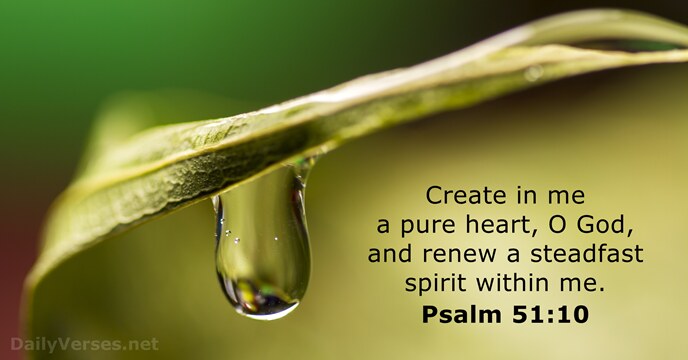 Notice that David asked God to create in him a pure heart. David didn’t promise to clean up his act on his own. Only God could make David’s heart new and pure. The same goes for me. All I can do is submit myself to his transforming power and follow his lead.